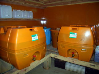 【竹酢液冷暗所】 集めた蒸気を一年以上冷暗所で貯蔵して、 竹酢液を作ります。